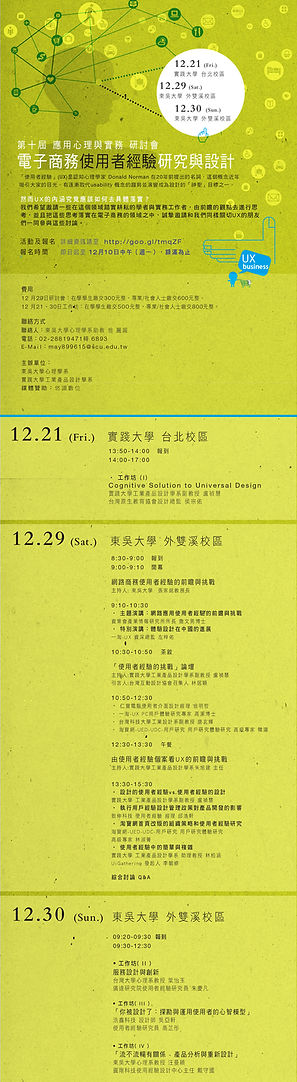 「使用者經驗(User Experiences, UX)」是認知心理學家Don Norman在20年前所提出的名詞,近年這個概念吸引了大家的目光,不但有逐漸取代「Usability」概念的趨勢,並演變成為設計的「神聖」目標之一。然而「UX」的內涵究竟應該如何去具體落實?在「2012電子商務使用者經驗研究與設計」研討會中,台灣及大陸的學者與實務工作者被邀請以此觀點討論在電子商務運作中,使用者經驗研究所面臨的挑戰與前景。研討會議程包括:一場演講論壇與個案研究的大型會議,及四場小型的設計心理工作坊。